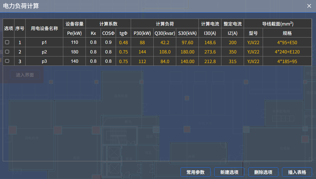 进入界面后,输入用电设备名称、设备容量、系数Kx、cosΦ,通过新建选项/删除选项功能可计算各配电设备的电力负荷参数。插入表格(✔确定)可在图面中插入相应的表格。