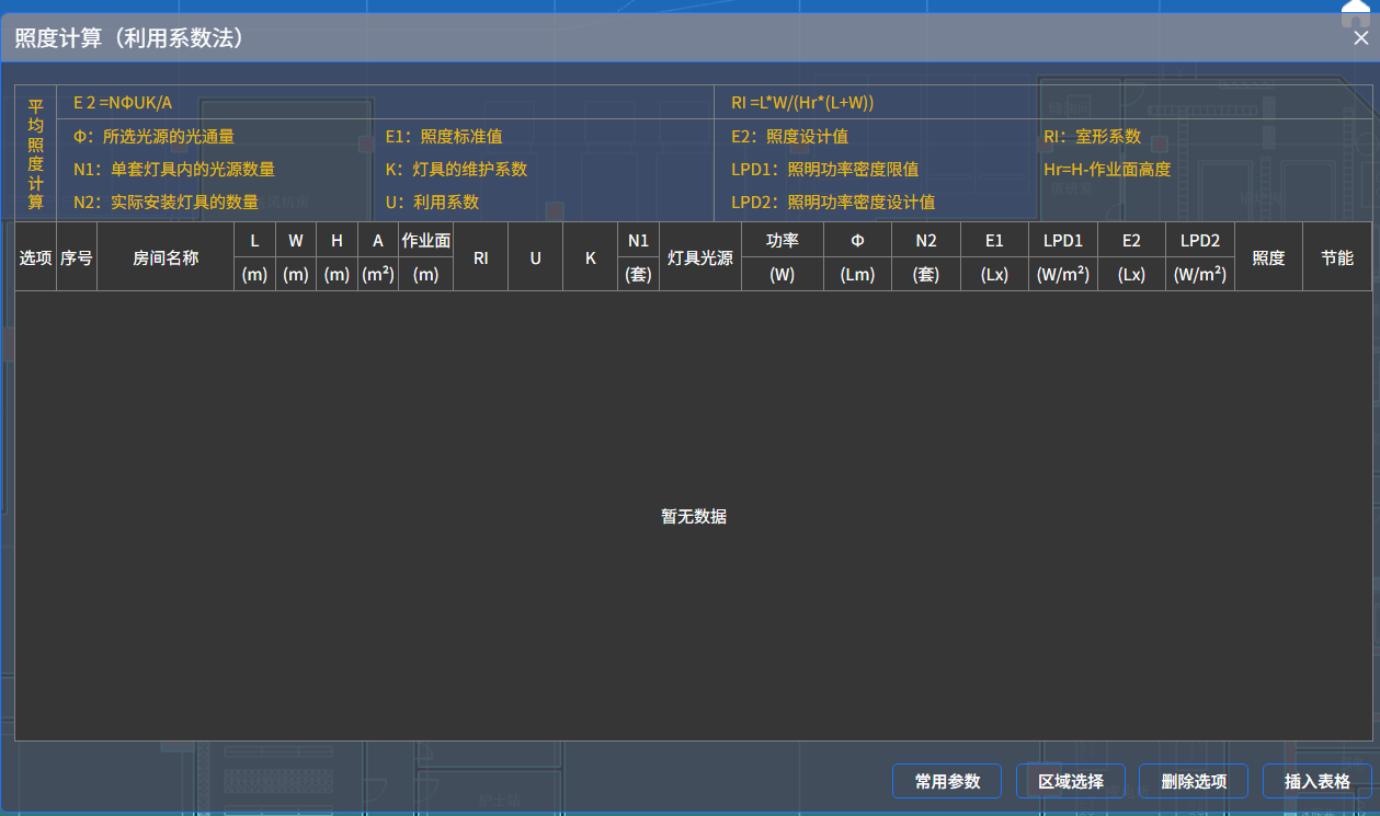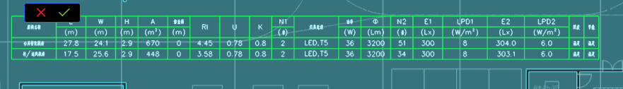 插入表格(✔确定) 可在图面中添加照度计算表格。