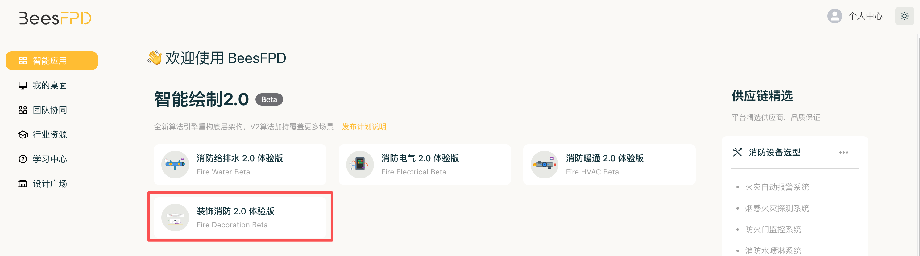 打开 BeesFPD 聚蜂消防 平台首页,在功能分类中选择 【装饰消防】,进入绘图工作区。