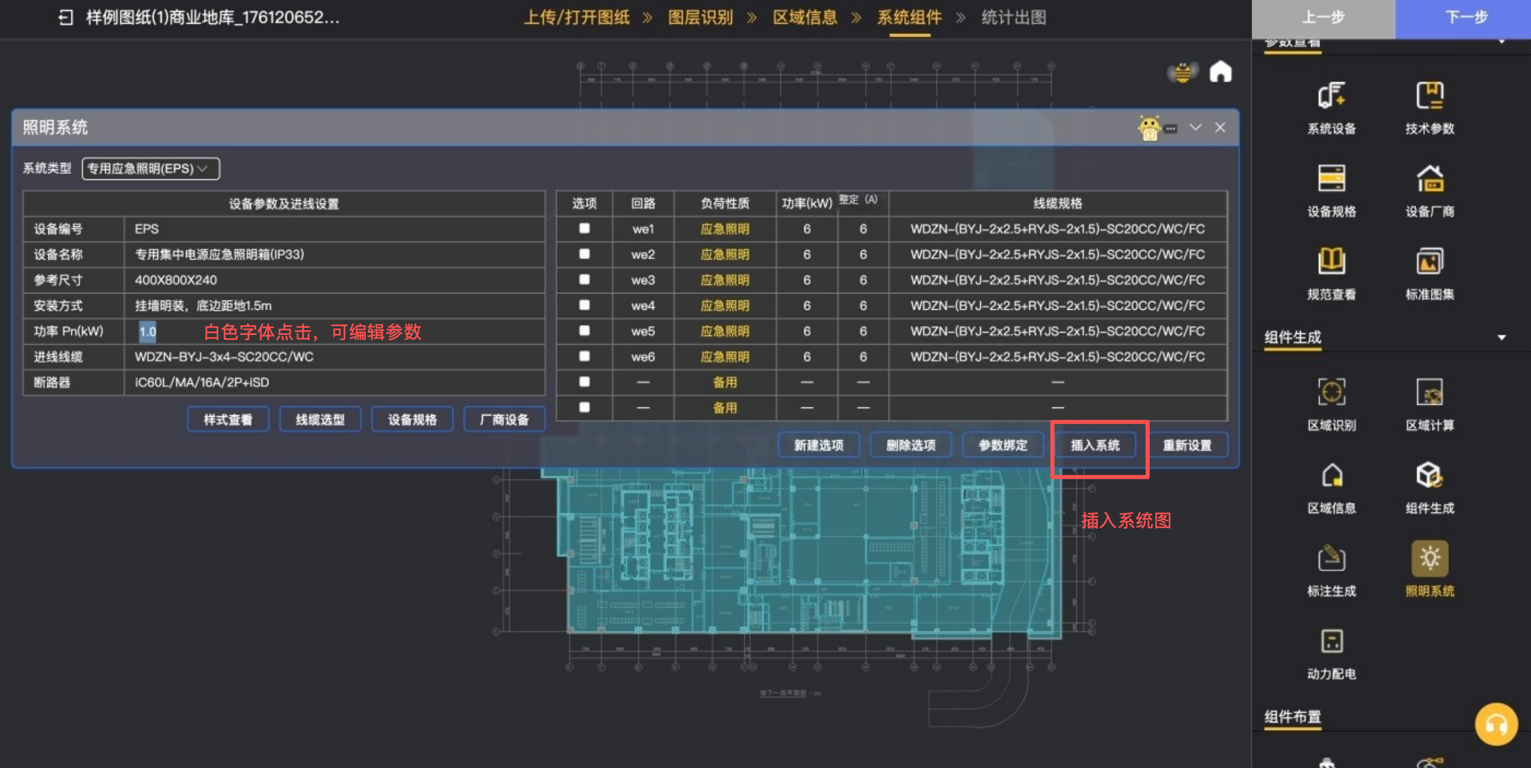输入参数后,系统会 自动计算照明负载与线路数据,实现智能参数化绘制。