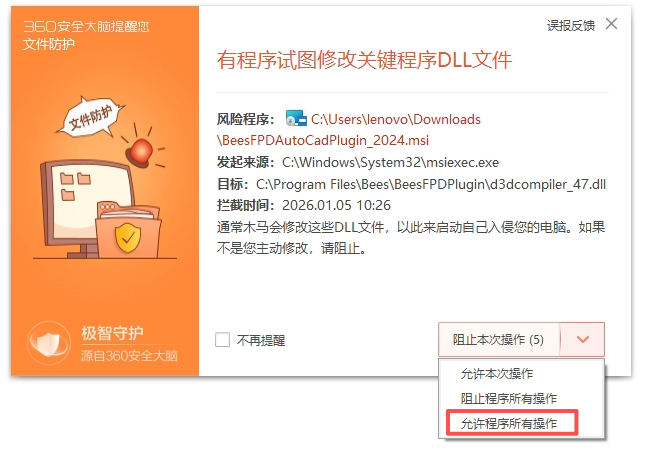 如果 360 等软件提示如下界面,请点击允许