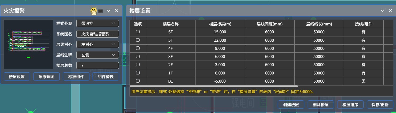 选择系统图样式外观,楼层设置调整后,在图面插入火灾报警系统图。
