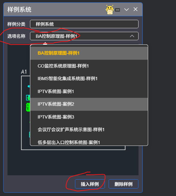 在选项名称列表中,选择所需要的系统图样式,并在图面插入样例。