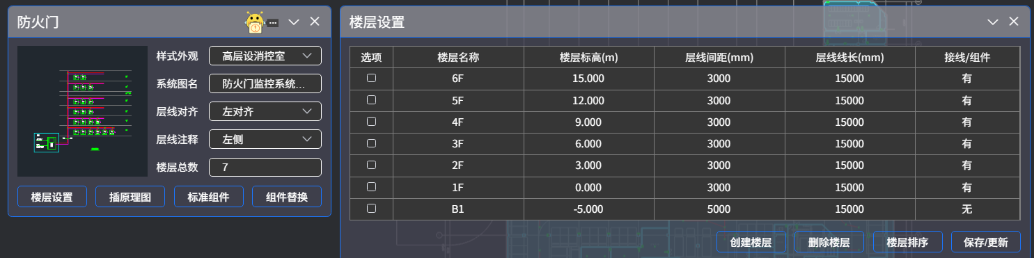 选择系统图样式外观,楼层设置调整后,在图面插入防火门监控系统图。