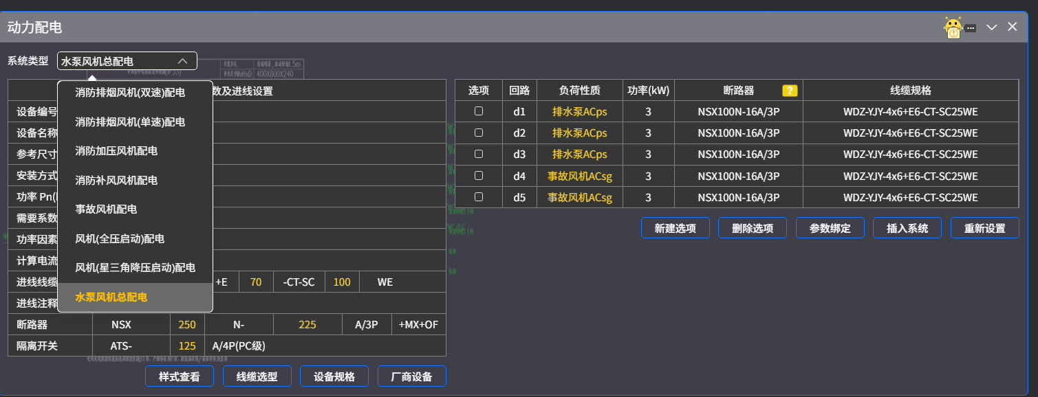 选择“系统类型”菜单内的样式,可以调整进线参数,出线回路可以增加或删除,并调整回路号、功率、整定值和线缆规格等。最后,在图面中插入各种类型动力配电系统图。