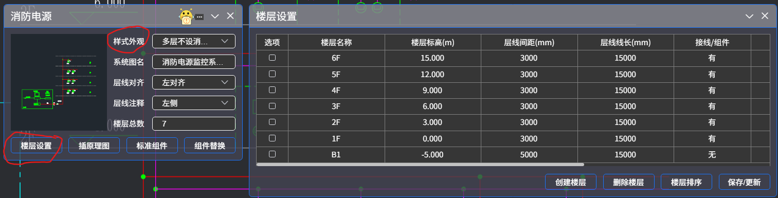 选择系统图样式外观,楼层设置调整后,在图面插入消防电源监控系统图。