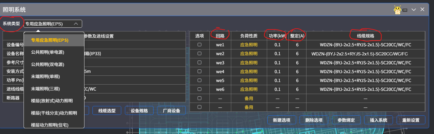 选择“系统类型”菜单内的样式,可以设置进线参数,增加或删除出线回路,并调整回路号、功率、整定值和线缆规格等。最后,在图面中插入照明系统图。