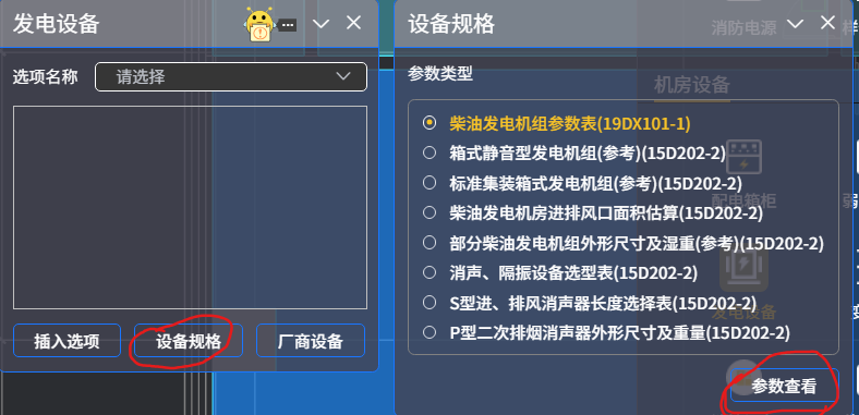 点击“设备规格/厂商设备”选项,参照表格中详细列出的设备规格参数,对发电机组的尺寸等参数进行调整。