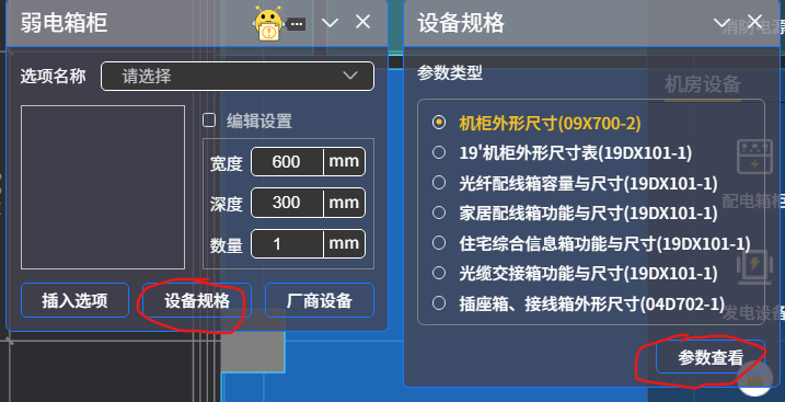 点击“设备规格/厂商设备”选项,参照表格中详细列出的设备规格参数,对弱电箱柜的尺寸等参数进行调整。