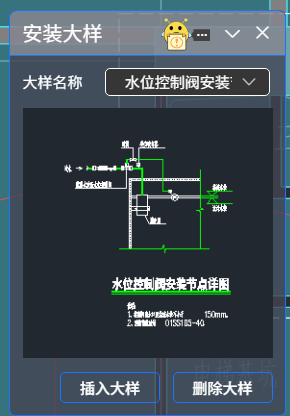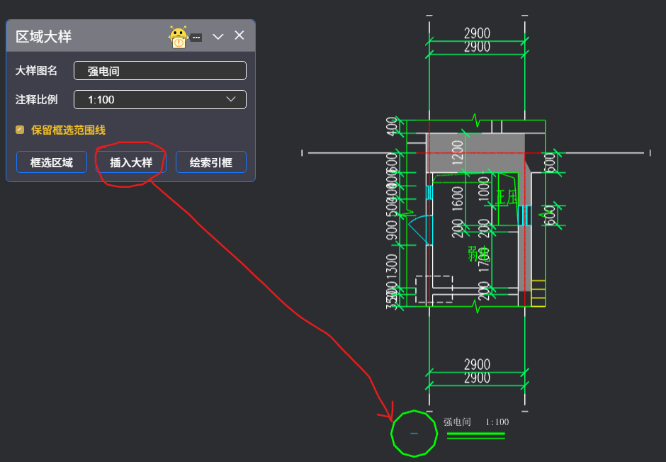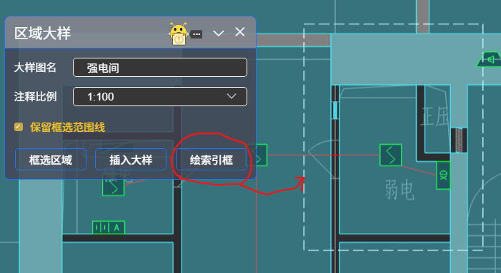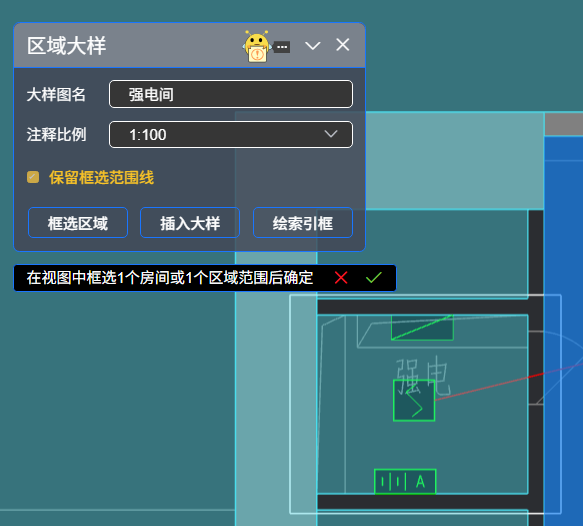 在图面上框选所需区域(如强电间)后,点击✔确认,随后插入大样,并在图面上绘制索引框。