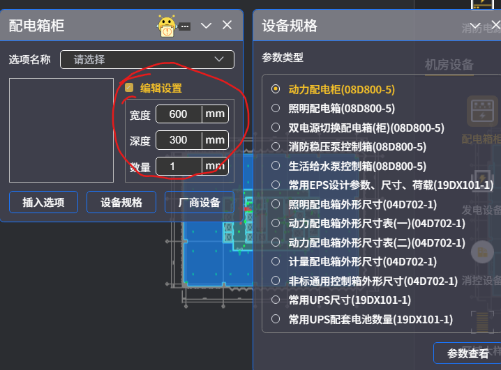 点击“设备规格/厂商设备”选项,参照表格中详细列出的设备规格参数,对配电箱柜的尺寸等参数进行调整。