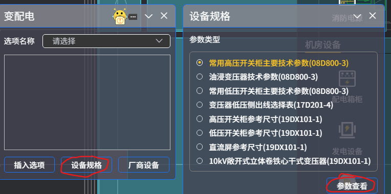 点击“设备规格/厂商设备”选项,参照表格中详细列出的设备规格参数,调整高低压配电柜和变压器的尺寸等参数。