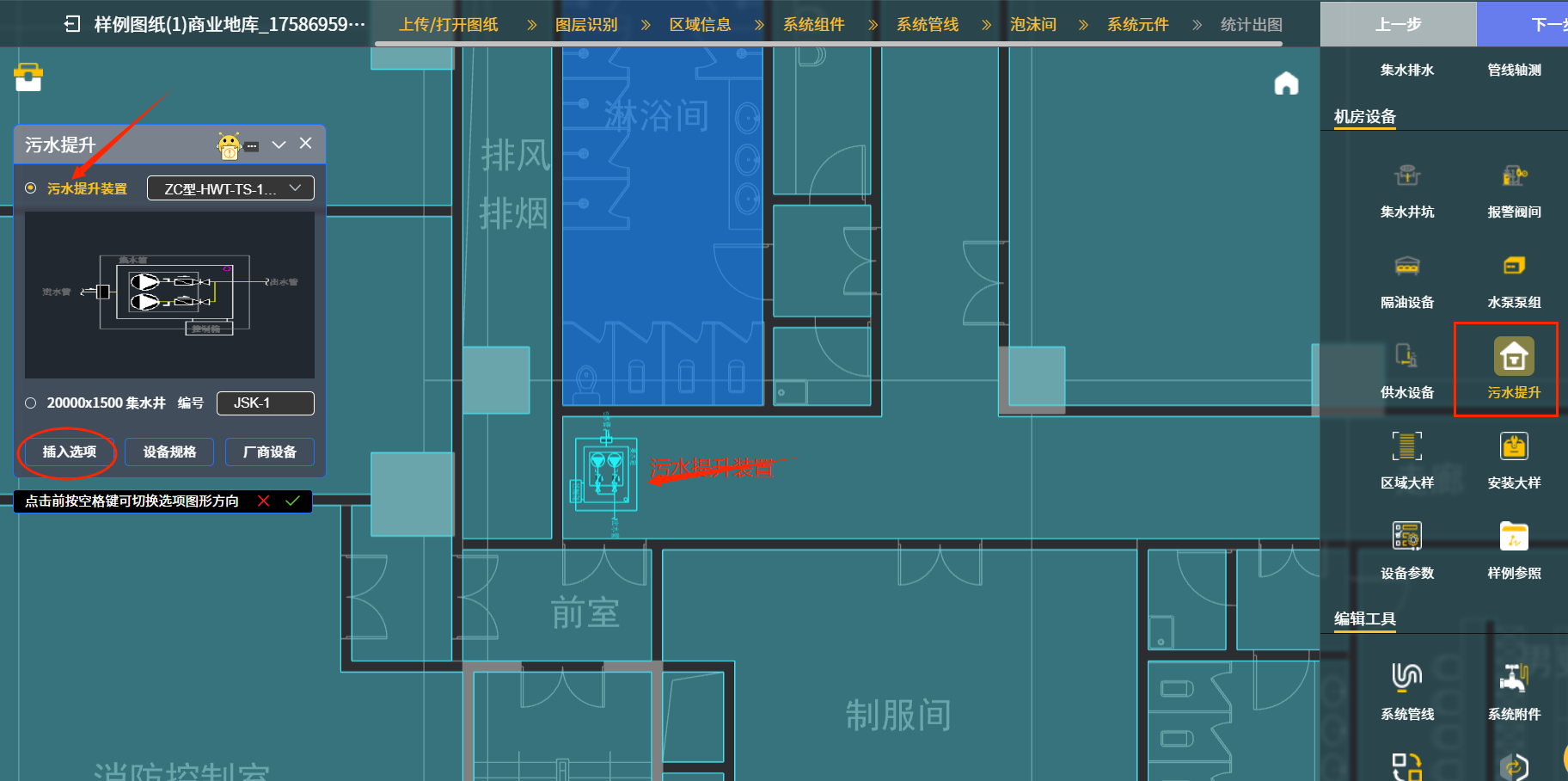 举例六:点“污水提升”图标后,下图七中在后续出现的对话框“污水提升装置”下拉菜单中选择选用的设备类型型号,然后再点击椭圆框内“插入选项”图标,系统就会把选好的污水提升装置图块插入到相应的污水提升区域,详见箭头处污水提升装置示例。该“污水提升”对话框中也可以选择““2000X1500集水井”项,这个选项是污水提升间内常见配置,集水井一般配置在污水提升装置设于地下室时。
