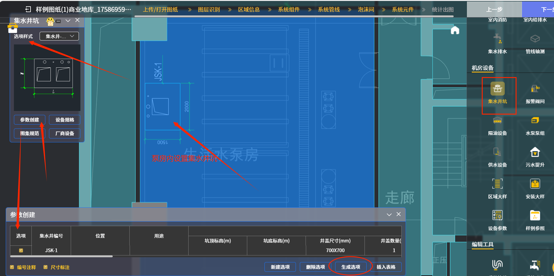 举例一:点“集水井坑”图标后,下图二中在后续出现的对话框“选项样式”选项中选择“集水井-2台水泵1”项(也可选择其他选项,本演示选取该项,一般集水井都是配置一用一备2台泵),继续点对话框下侧“参数创建”图标,系统就会出现“参数创建”对话框,里面可以选择集水井编号及编号注释,尺寸标注等选项;最后点击椭圆框内“生成选项”图标,就可以把选好的集水井(含泵)图块插入到相应泵房内,详见箭头处集水井坑示例。