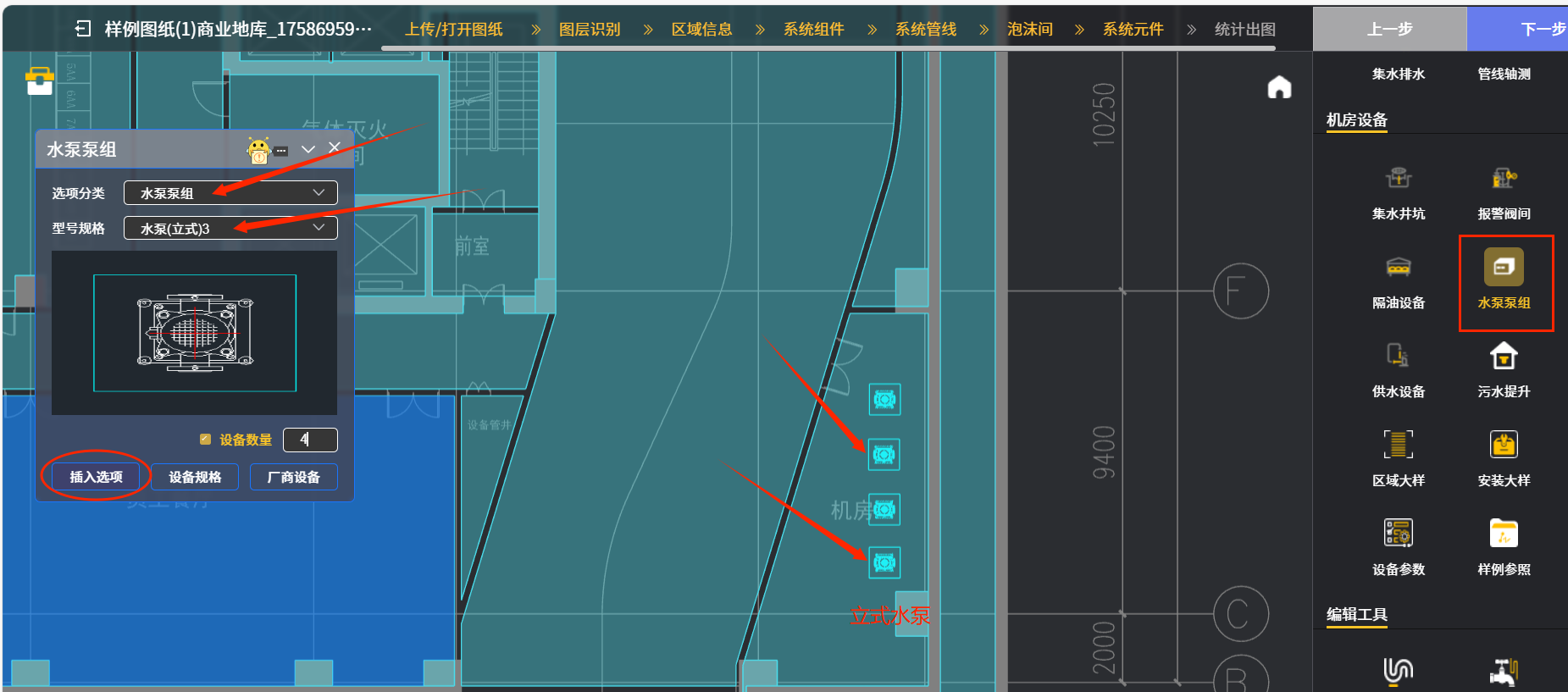 举例四:点“水泵泵组”图标后,下图五中在后续出现的对话框“选项分类”下拉菜单中选择选用的设备类型(包括水泵泵组和给水稳压装置2个选项),继续在下侧“型号规格”下拉菜单中选择具体水泵型号,同时在“设备数量”栏中输入水泵的数量;最后再点击椭圆框内“插入选项”图标,系统就会把选好的水泵图块插入到相应的泵房区域,详见箭头处4台立式水泵示例。