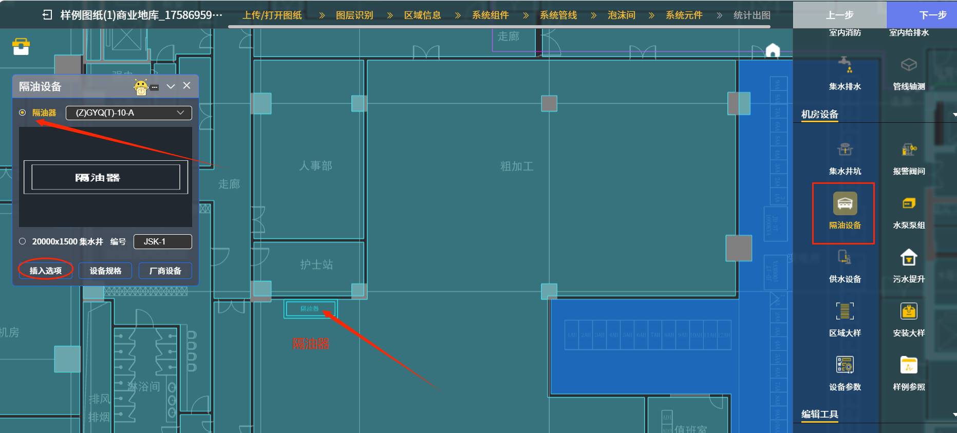 举例三:点“隔油设备”图标后,下图四中在后续出现的对话框“隔油器”下拉菜单中选择设计时选用的设备型号,继续点对话框下侧“插入选项”图标,系统就会把选好的隔油器图块插入到厨房间需要隔油的区域,详见箭头处隔油器示例。该“隔油设备”对话框中也可以选择““2000X1500集水井”项,这个选项都是隔油间内常见配置,集水井一般配置在隔油间设于地下室时。