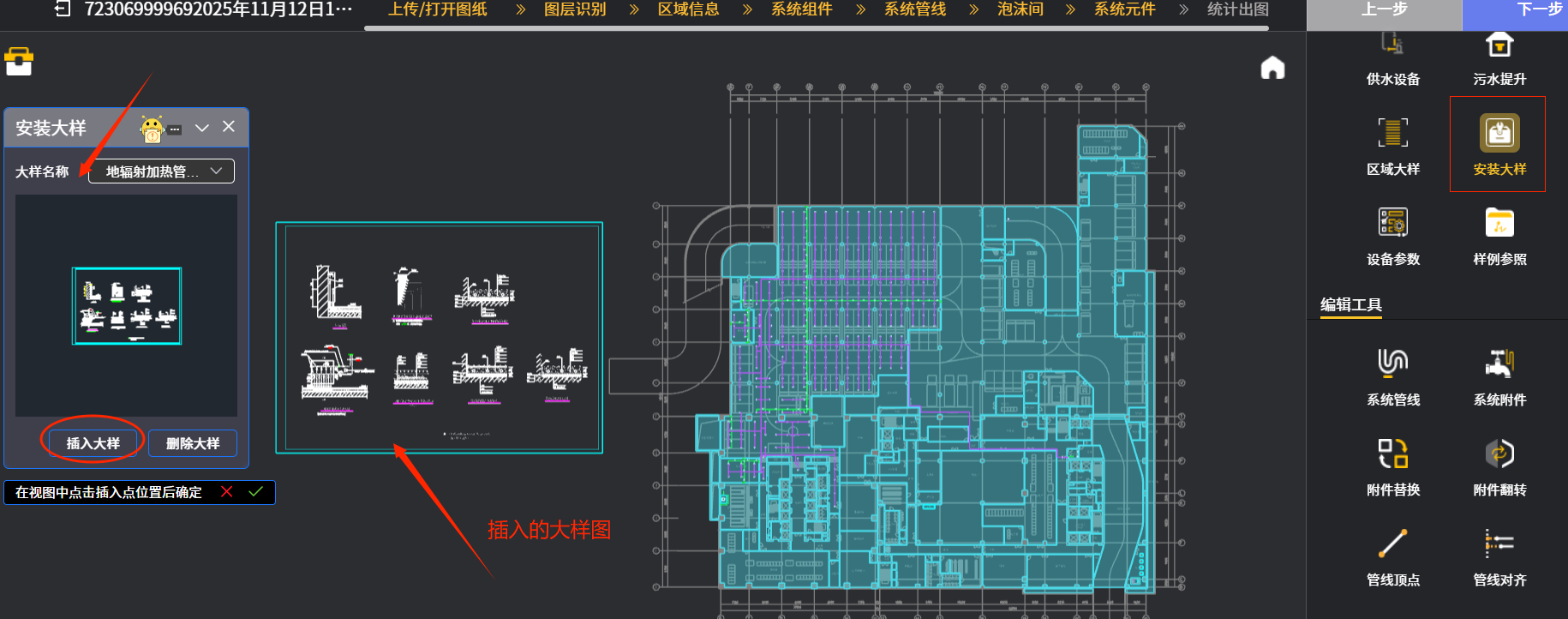 举例八:点“安装大样”图标后,下图九中在后续出现的对话框中“大样名称”下拉菜单中选择需输入的大样图名(示例为第一个选项);然后再先后点击椭圆框内“插入大样”图标,系统就会把选好的大样图插入到使用者指定区域,详见箭头处大样图示例。这个“安装大样”对话框内提供的大样图都是水专业常用的设备安装和卫生间大样图等,可以给使用者提供参考。