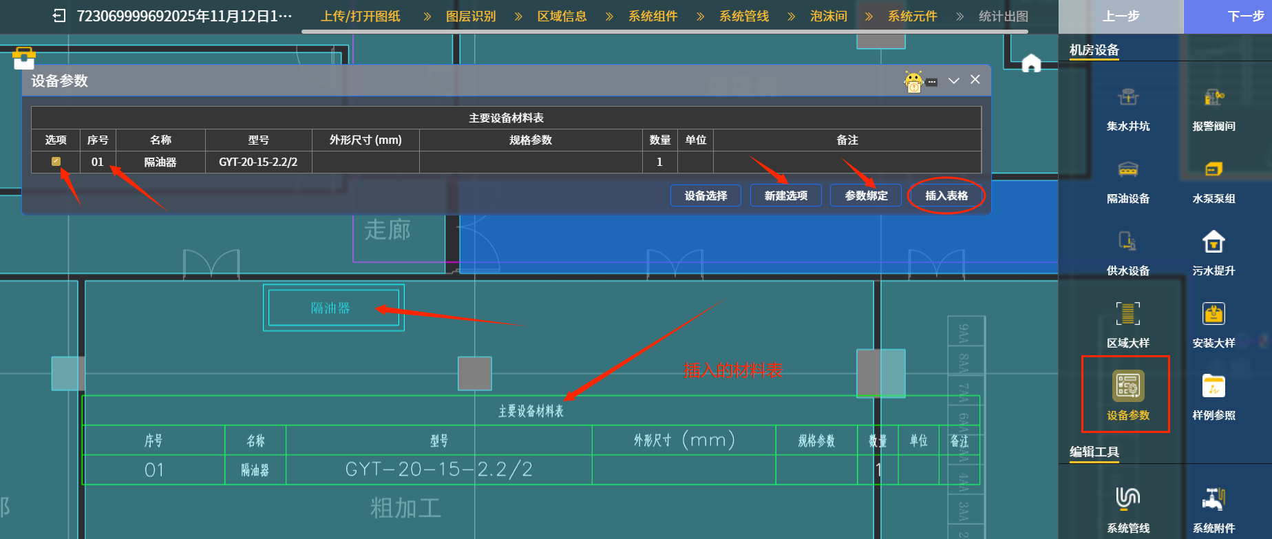 举例九:点“设备参数“图标后,下图十中在后续出现的对话框中点击“新建选项”图标,可以在”主要设备材料表“中依次输入各种设备的名称和参数;如下图十中序号01的隔油器,在其”选项“勾选后,再点击“参数绑定”图标,随后点选箭头处”隔油器“图例,就能把隔油器图例和参数绑定。”参数绑定“图标右侧椭圆框内的“插入表格“图标点击后,可以把”设备参数“对话框内选项内容按表格形式插入到图纸当中,详见箭头处插入的材料表示例。