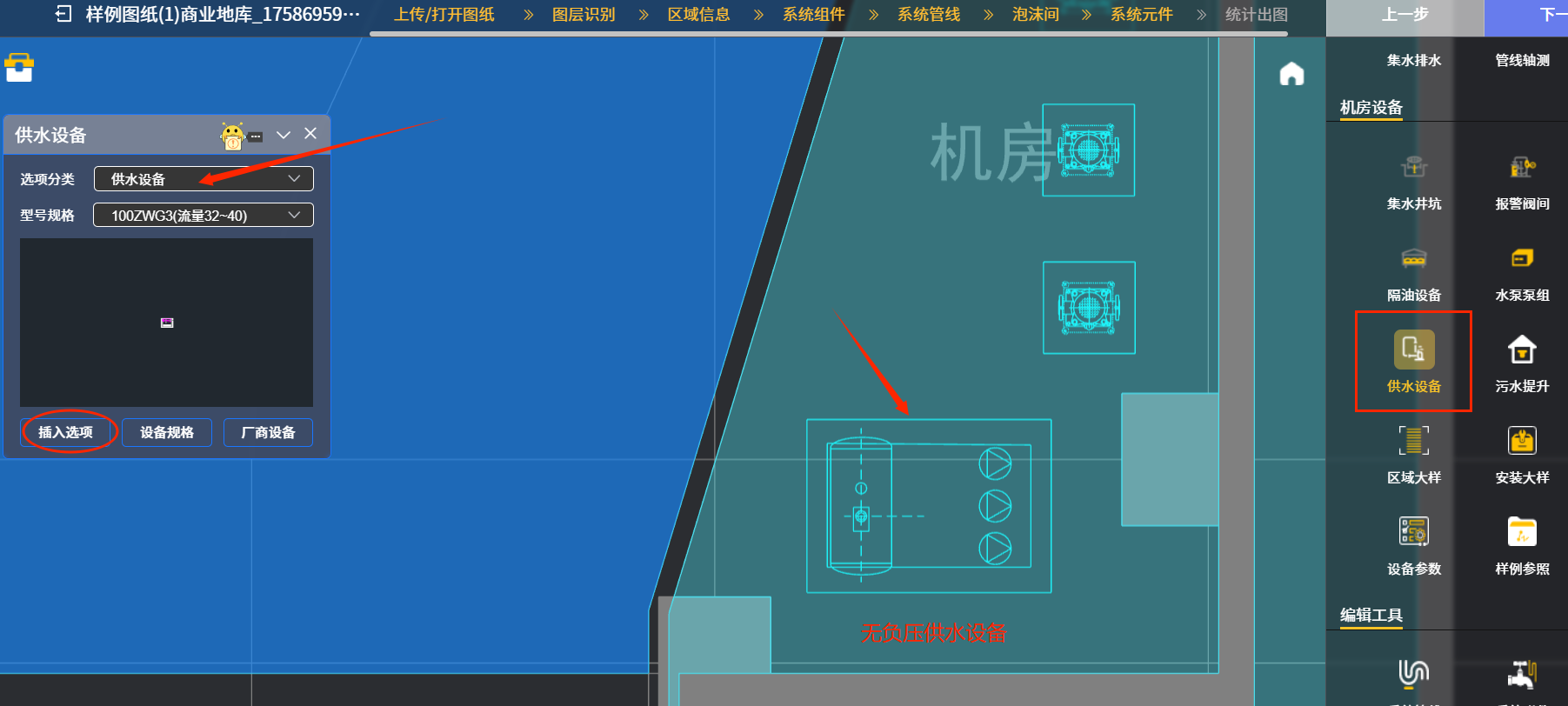 举例五:点“供水设备”图标后,下图六中在后续出现的对话框“选项分类”下拉菜单中选择选用的设备类型(包括集成泵站,给水箱,供水设备,消毒设备和控制柜5个选项),继续在下侧“型号规格”下拉菜单中选择具体设备型号;最后再点击椭圆框内“插入选项”图标,系统就会把选好的设备图块插入到相应的泵房区域,详见箭头供水设备示例。“插入选项”图标右侧的“设备规格”图标点击后会出现与供水设备相关的各种变频供水设备,水箱,水质消毒器的参数查看;“设备规格”图标右侧的“厂商设备”图标点击后会出现各种给水,消防等类型设备供应商的产品的信息展示,供设计师参考和选用。