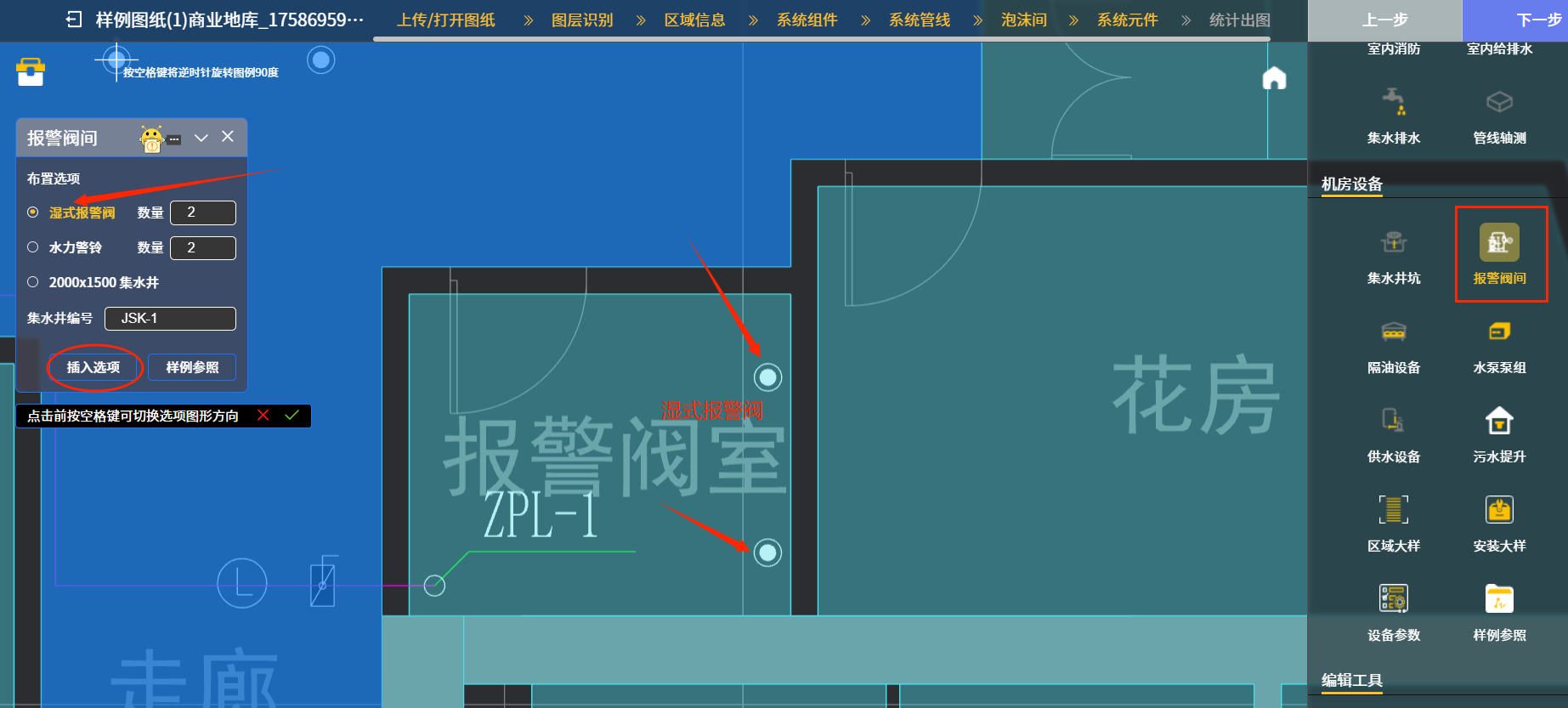 举例二:点“报警阀间”图标后,下图三中在后续出现的对话框“布置选项”栏中选择“湿式报警阀”项(举例时数量暂定为2个;实际设计时按确定报警阀数量来定),继续点对话框下侧“插入选项”图标,系统就会把选好数量的报警阀图块插入到相应报警阀间内,详见箭头处喷淋报警阀示例。该“报警阀间”对话框“布置选项”栏中也可以选择“水力警铃”项和“2000X1500集水井”项,这2个选项都是报警阀间内常见配置,其中集水井一般配置在报警阀间设于地下室时。