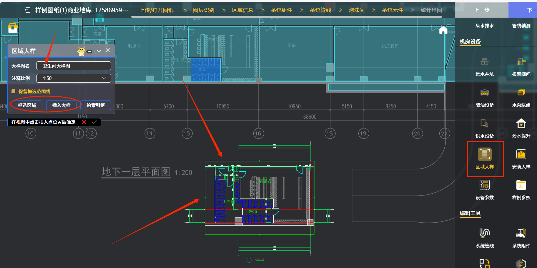 举例七:点“区域大样”图标后,下图八中在后续出现的对话框中“大样图名”下输入大样图名(示例为“卫生间大样图)”;“注释比例”下拉菜单中选择1:50的选项。然后再先后点击椭圆框内“框选区域”和“插入大样”图标,系统就会把框选好的建筑图上卫生间区域抠取出来,做成大样图插入到使用者指定区域,详见箭头处卫生间大样图示例。