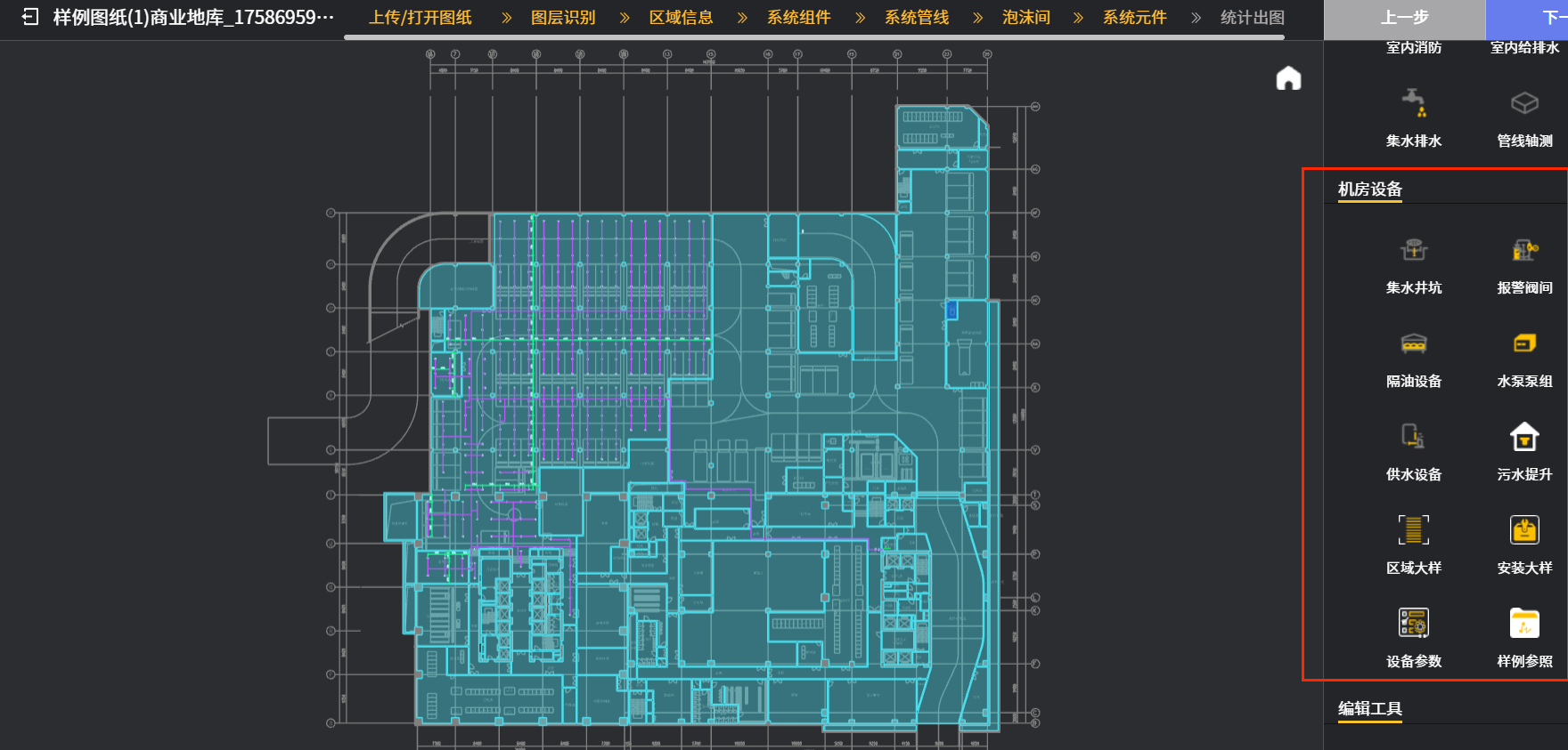 点击“泡沫间”页的“下一步”图标就进入“系统元件”页面,经过自主生成后的图纸框选范围会呈现自动生成的喷淋等消防系统的平面图;同时这些平面图的各系统干管,支管都已基本连通,设计进入到机房布置和绘制机房详图阶段。该页面“机房设备”栏包含下图一红框内的10个图标,主要是辅助完成给排水专业负责的室内各泵房,隔油设备间,污水提升间,卫生间的设备选型布置以及机房卫生间详图的绘制工作。下面逐一举例演示: