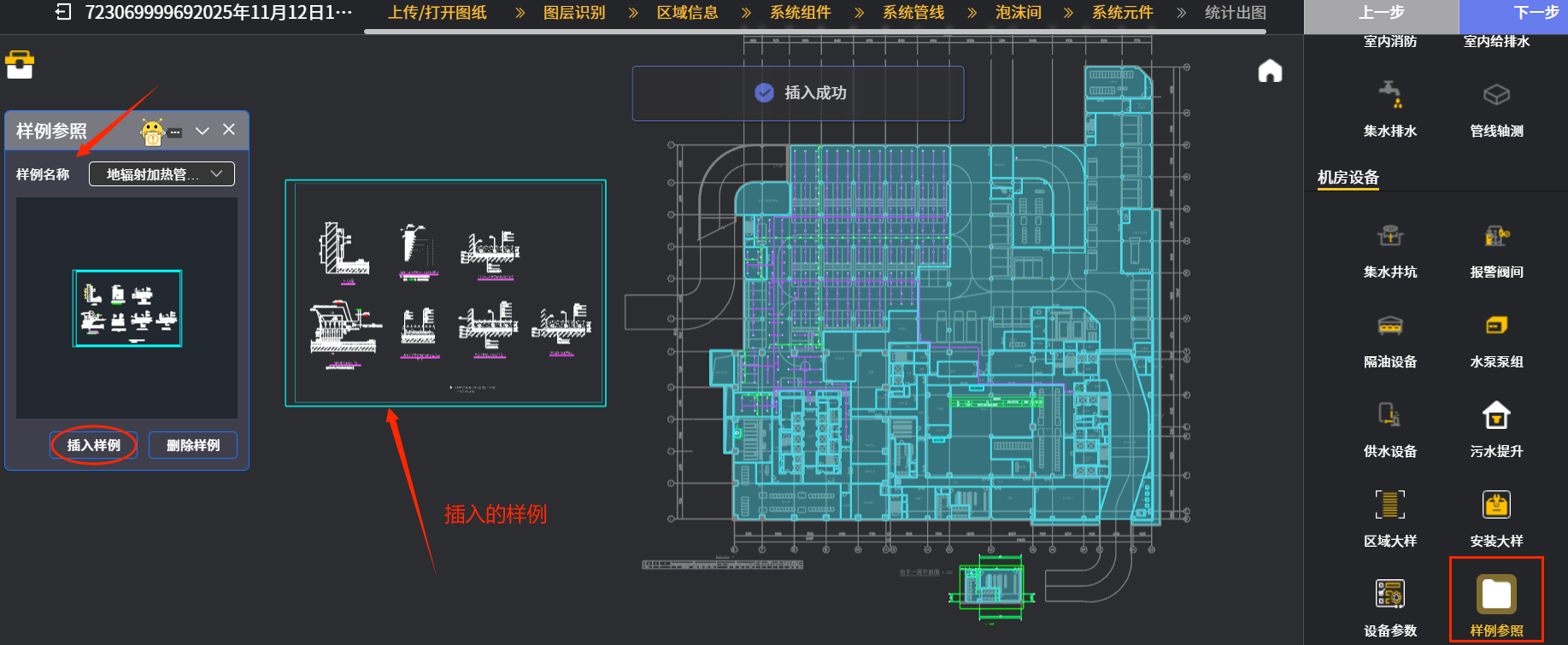 举例十:点“样例参照”图标后,下图十一中在后续出现的对话框中“样例名称”下拉菜单中选择需输入的样例名称(示例选择第一个选项);然后再点击椭圆框内“插入样例”图标,系统就会把选好的样例图插入到使用者指定区域,详见箭头处样例图示例。这个“样例参照”对话框内提供的样例图都是水专业常用的设备安装样例图,可以给使用者提供参考。