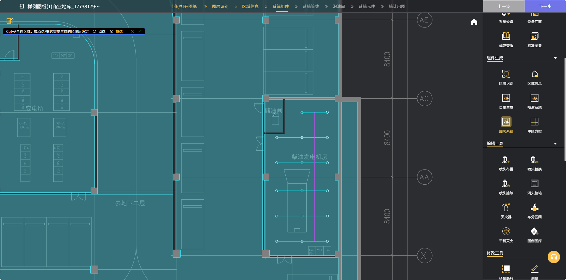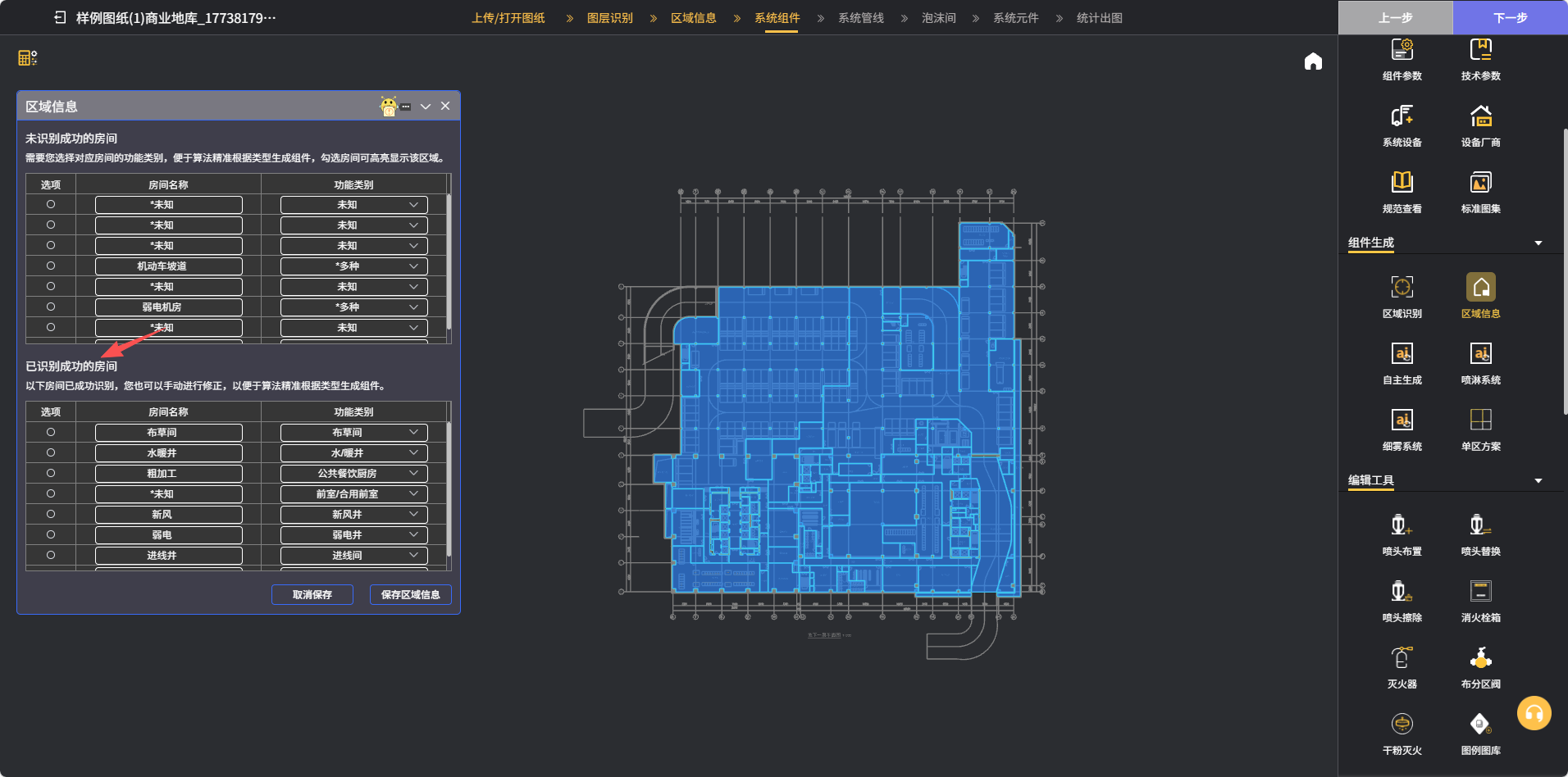 “区域信息”页点击“下一步”图标就进入“系统组件”页面,经过图层识别后的框选范围会呈现下图一的蓝色区域.;该页面“组件生成”栏包含下图一红框内的6个图标,主要是对图中的内容进行区域识别,核实区域信息,单个自主生成水专业设备以及消防喷淋,细水雾系统图等。