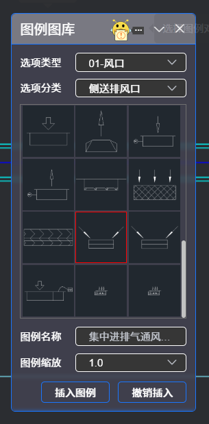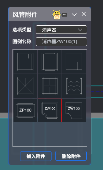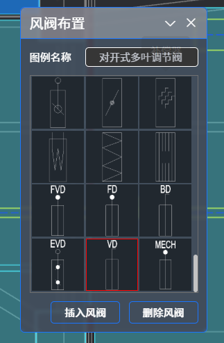 点击“风阀布置”,弹出如下对话框:下拉滚动条,点选需要插入的阀门图例。