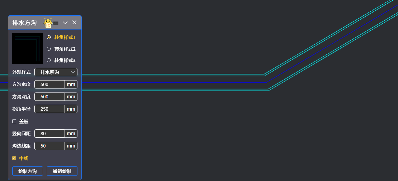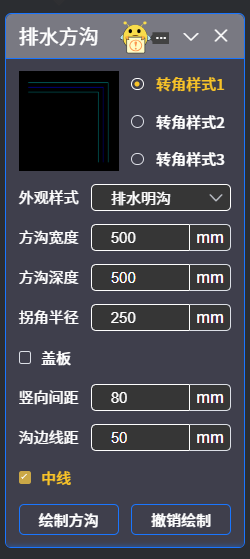 选择三种“转角样式”中的一种,选择外观样式是“排水明沟”还是“排水暗沟”,编辑沟的各项尺寸信息,点击“绘制方沟”按钮,平面图相应位置绘制,勾选☑️,绘制效果如下图所示: