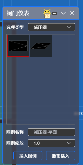 在下拉列表中选择阀门类型,如选择减压阀,对话框显示平面或轴测图例的表达,选中一种图例,图例缩放比例在下拉菜单中可调,默认为1.0,点击“插入图例”按钮,在平面图相应位置点击,该阀门插入图中,如下图所示: