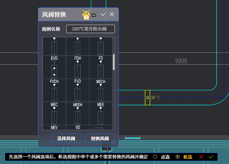 根据提示选择多个风阀,勾选✅完成,在所示图例中找到一个新的风阀图例,点击“替换风阀”,系统一键替换选中的所有风阀。