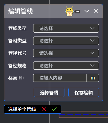 选择想修改的空调水管,可编辑其规格或其他信息,点击“选择管线”,在平面图点选单个管线,勾选☑️确认后,该水管信息修改后,点选“保存编辑”。