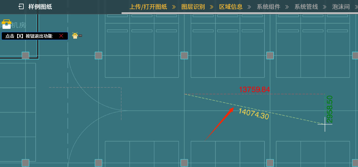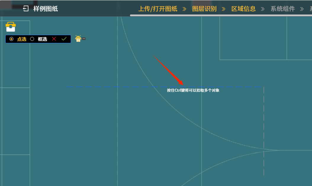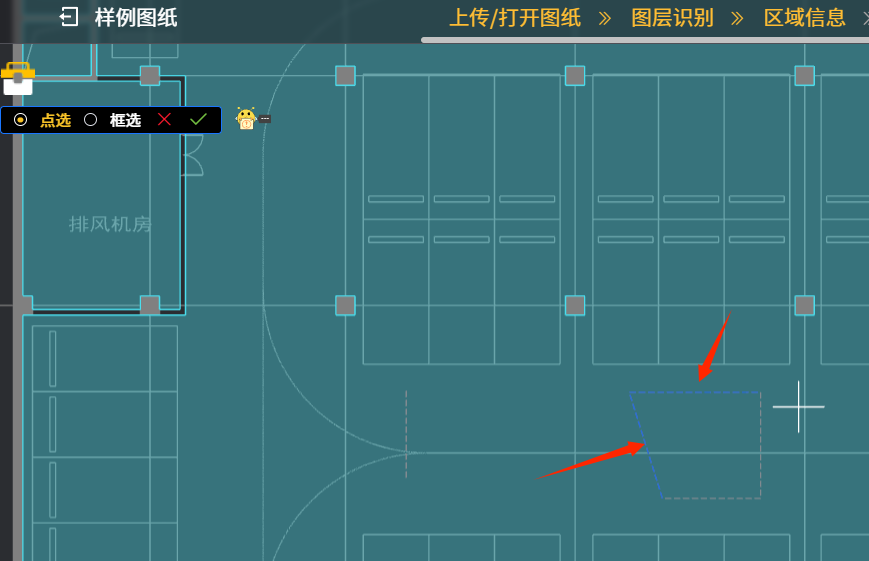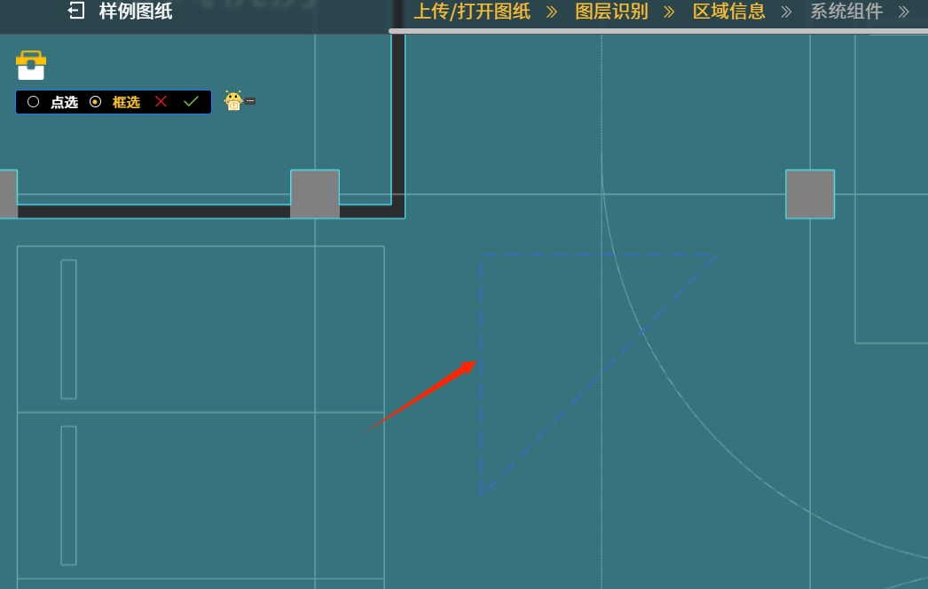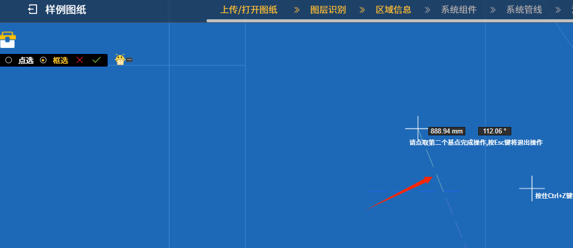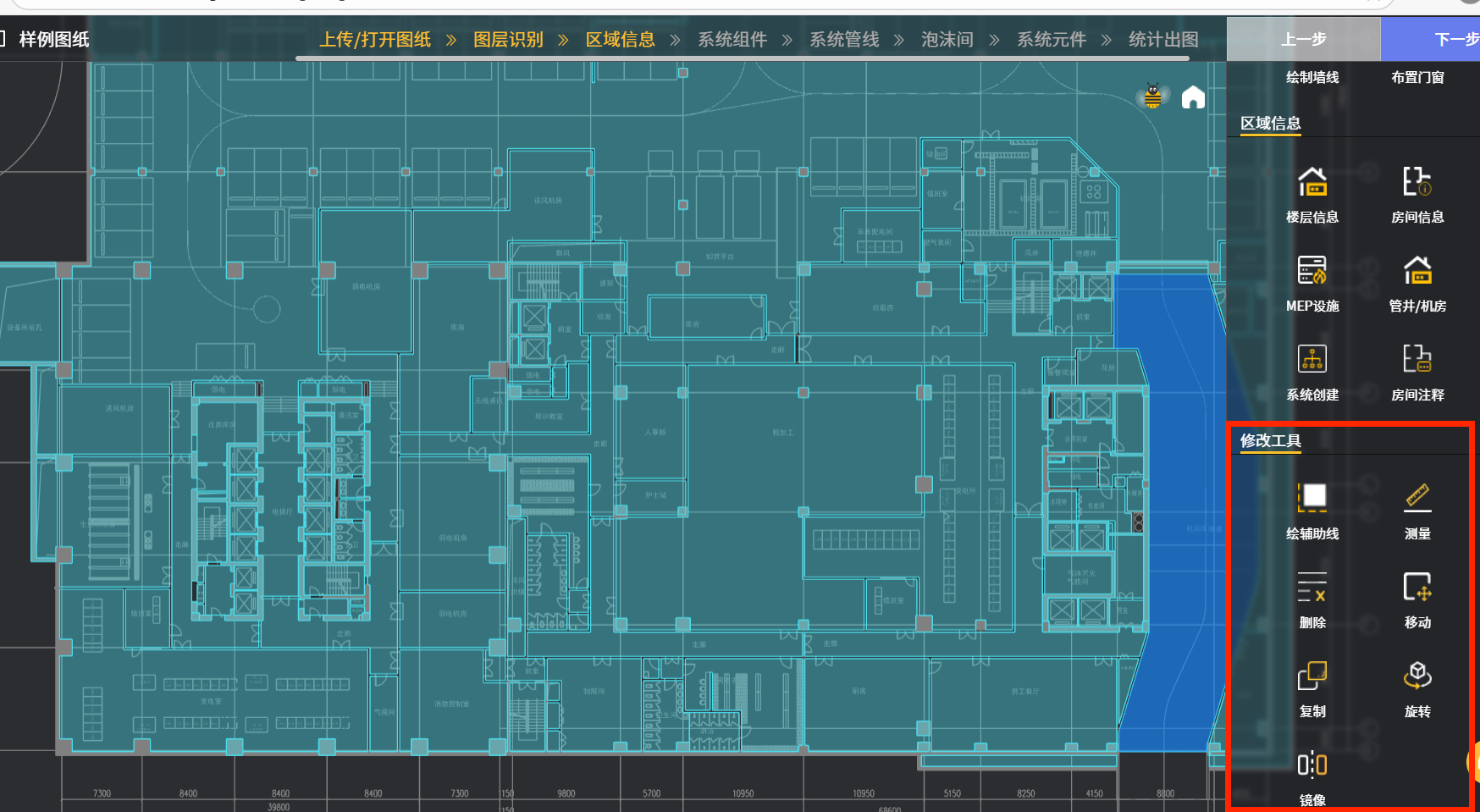 进入“区域信息”页面后,经过图层识别后的框选范围会呈现下图一的宝蓝色区域。“修改工具”栏包含下图一红框内的7个图标,主要是对图中的内容进行测量,删除,移动,复制,旋转,镜像等编辑。下面逐一举例演示:
