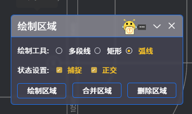 此对话框允许用户通过选择“绘制区域”选项,可以使用“多段线”工具绘制一个多边形区域,完成闭合后点击绿色勾号确认,该区域即添加成功。选择“矩形”选项,可直接绘制一个矩形区域;选择“弧线”选项,则可以绘制带有弧线的闭合区域。