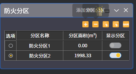 点击黄色的“+”或“-”按钮可以添加或删除一个防火分区。在“分区名称”栏中,您可以为相应的防火分区命名。点击下方的“增加区域”或“删除区域”按钮,可以向该防火分区添加房间。选择房间的方式包括框选或点选。完成选择后,点击“save”按钮以保存设置,此时该防火分区的面积将自动计算并显示,如上图所示。