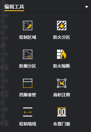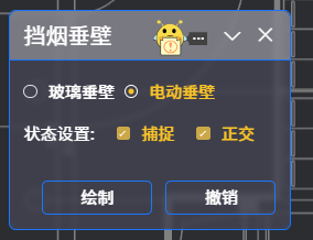 点击"挡烟垂壁"可选择添加"玻璃垂壁"或"电动垂壁"。点击"绘制"按钮可绘制多段线,绿色勾号表示绘制成功。若需取消最后一次绘制的挡烟垂壁,可点击"撤销"按钮。