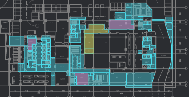 每个命名的防烟分区均以特定颜色显示,不同的防烟分区采用不同的颜色进行高亮标识,例如上图中的粉色和黄色等。(防烟分区应不穿越防火分区,选取房间时必须保证在同一防火分区内选择房间,不可选取不同防火分区的房间)