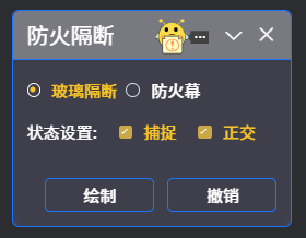 点击"防火隔断"选项,您可以选择添加"玻璃隔断"或"防火幕"。点击"绘制"按钮,可以绘制多段线,绿色勾号表示绘制成功。若需取消最后一次绘制的防火隔断,只需点击"撤销"按钮。