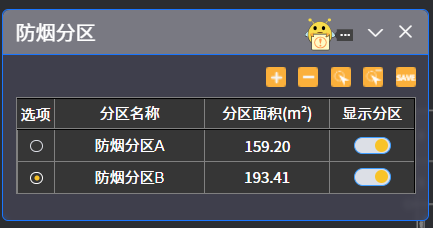 点击黄色的“+”或“-” 按钮可以添加或删除一个防烟分区。在“分区名称”栏中输入名称,以对相应的防烟分区进行命名。点击下方的“增加区域”或“删除区域” 按钮,可以向该防烟分区添加房间。选择房间的方式支持框选或点选。完成选择后,点击“save” 按钮以保存设置。该防烟分区的面积将自动计算并显示,如上图所示。