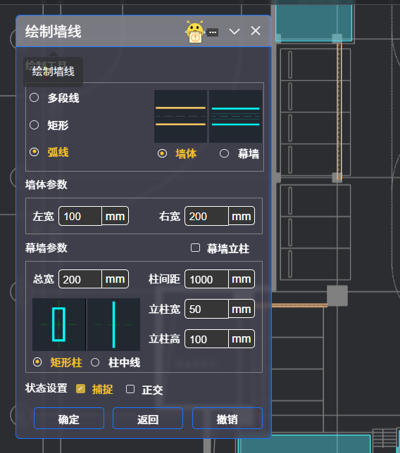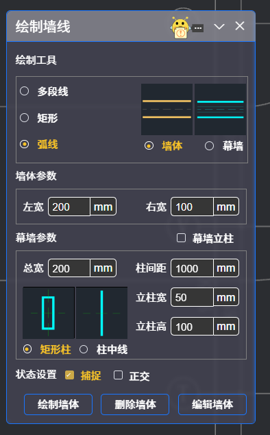 点击“绘制墙线”按钮后,您可以选择“多段线”来绘制一段墙体,选择“矩形”来创建一个四面墙体围合的空间,或者选择“弧线”来绘制一段带有弧度的墙体。每段墙体的绘制均以中心线为基准,左右宽度则可根据具体需求灵活调整。