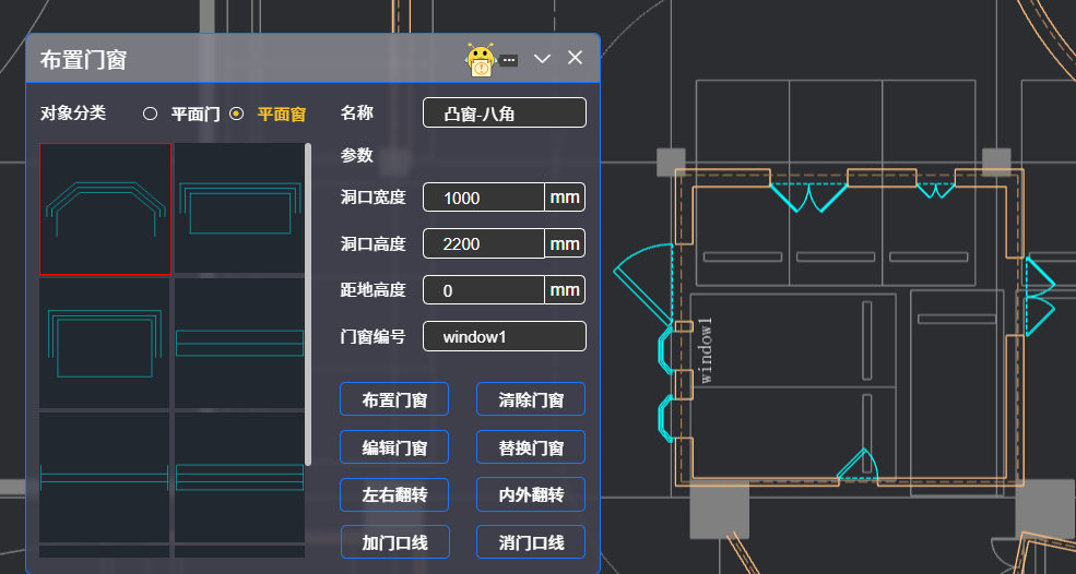 打开“布置门窗”对话框,选择左侧的“平面门”或“平面窗”图例。在参数表中,可以调整洞口的宽度、高度等详细信息,并为门窗进行编号。点击“布置门窗”按钮,在墙体的指定位置单击,随后选择门窗开启方向的区域空间,再次单击该区域,门窗将朝向选定的一侧安装完成,具体如下所示。