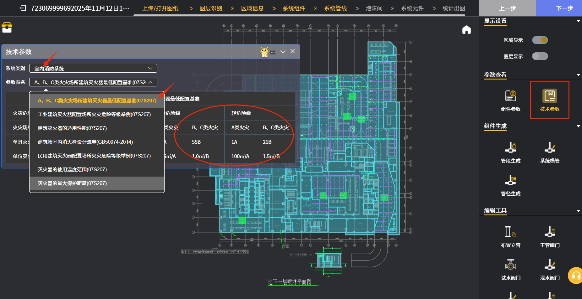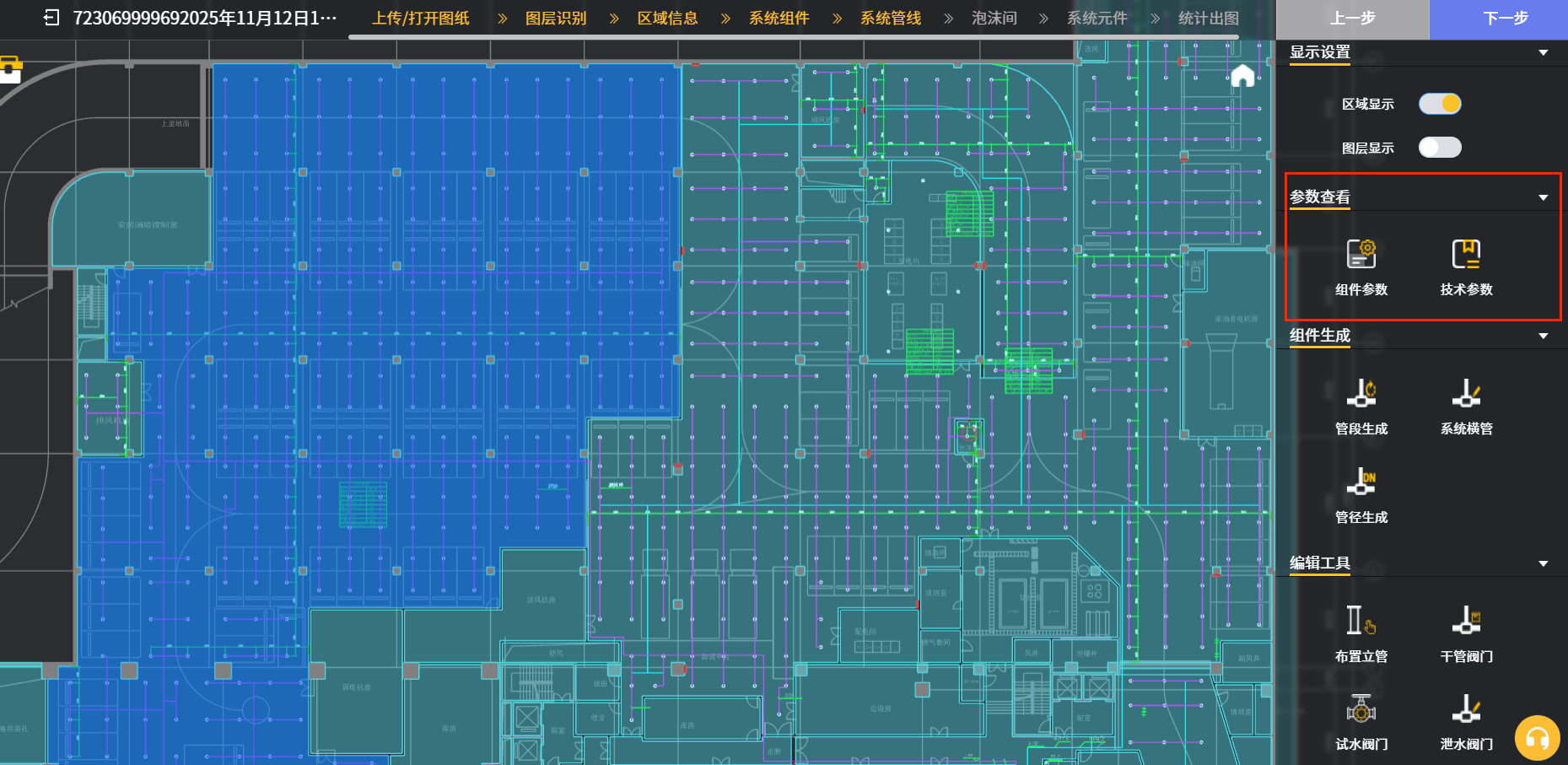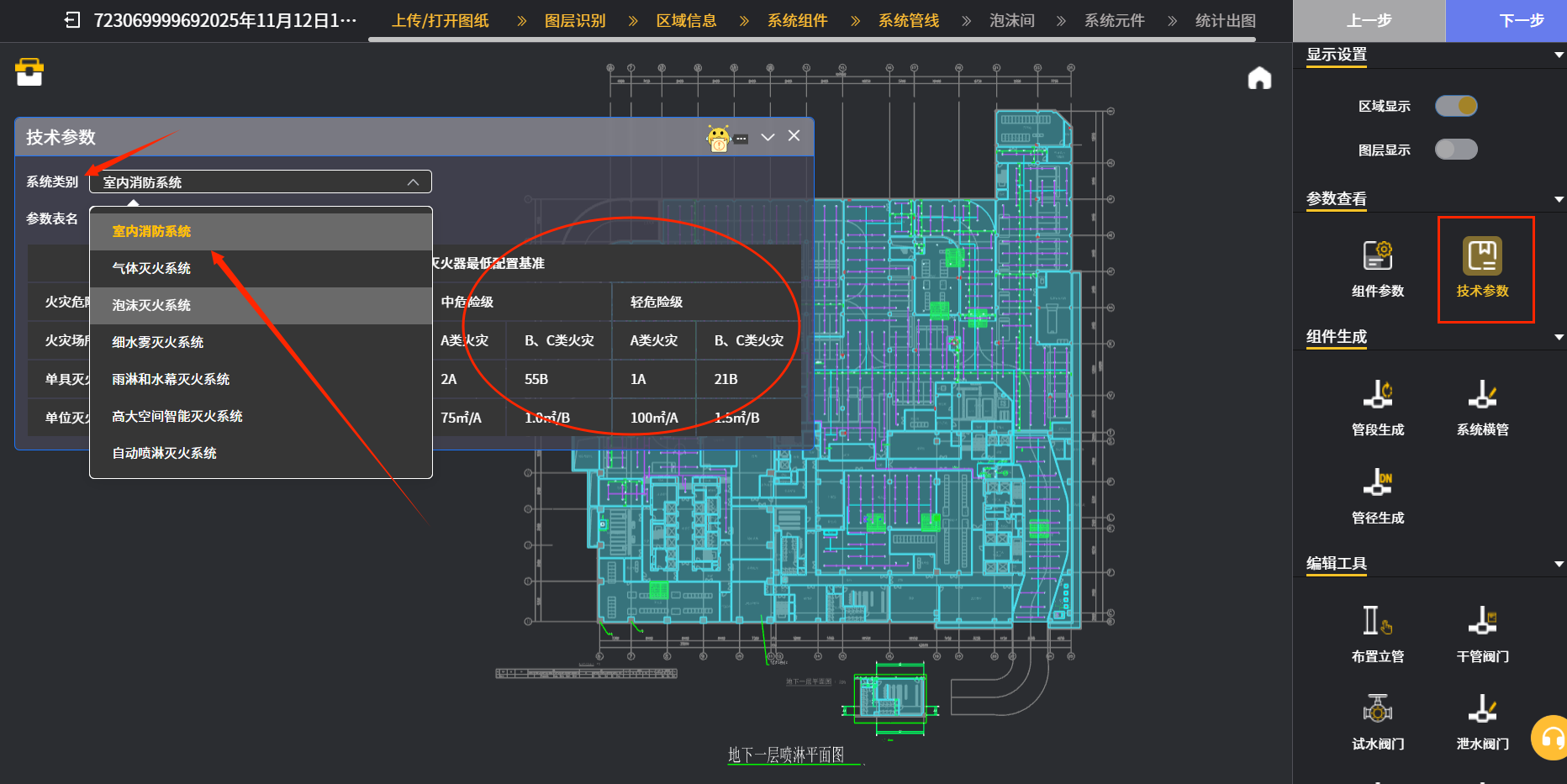 点击“系统组件”页的“下一步”图标就进入“系统管线”页面,经过自主生成后的图纸框选范围会呈现自动生成的喷淋等消防系统的平面图;该页面“参数查看”栏包含下图一红框内的2个图标,主要是提供图中的各消防系统所包含的设施(喷头,消火栓,灭火器,气体灭火)的技术参数,方便使用者进行系统的设计和选型。