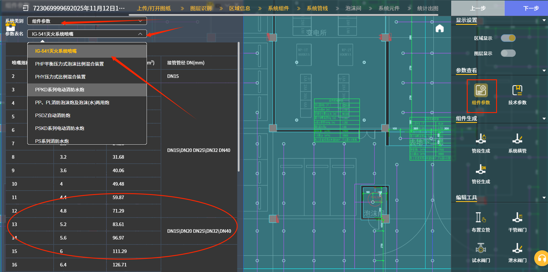 举例一:点“组件参数”图标后,下图二中在后续出现的对话框内“参数表名”下拉菜单中有各种消防系统组件的性能参数:包含了各种喷头,气体灭火的喷嘴,泡沫比例混合器,自动消防水炮,水流指示器等组件。椭圆框内就是“IG541灭火系统喷嘴”中各种喷嘴的技术参数。这个“组件参数”功能,就是方便使用者能很快的对各类型消防系统的组件进行选型。