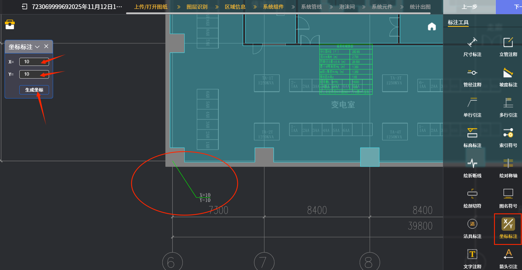 举例十四:点“坐标标注”图标后,在下图十五对话框中箭头处需输入X轴和Y轴的坐标数值。随后点击箭头处“生成坐标”图标,然后选取需标注坐标的点,就可以生成该点的坐标了;椭圆红框内即为生成的操作结果。