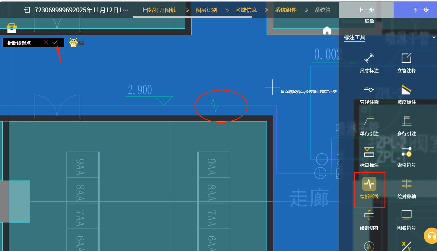 举例九:点“绘折断线”图标后,下图十中在需要绘折断线符号的管线上选取折断线的起点和终点,选好后点击箭头处“√”予以确认;此时椭圆红框内管线新增折断线符号。
