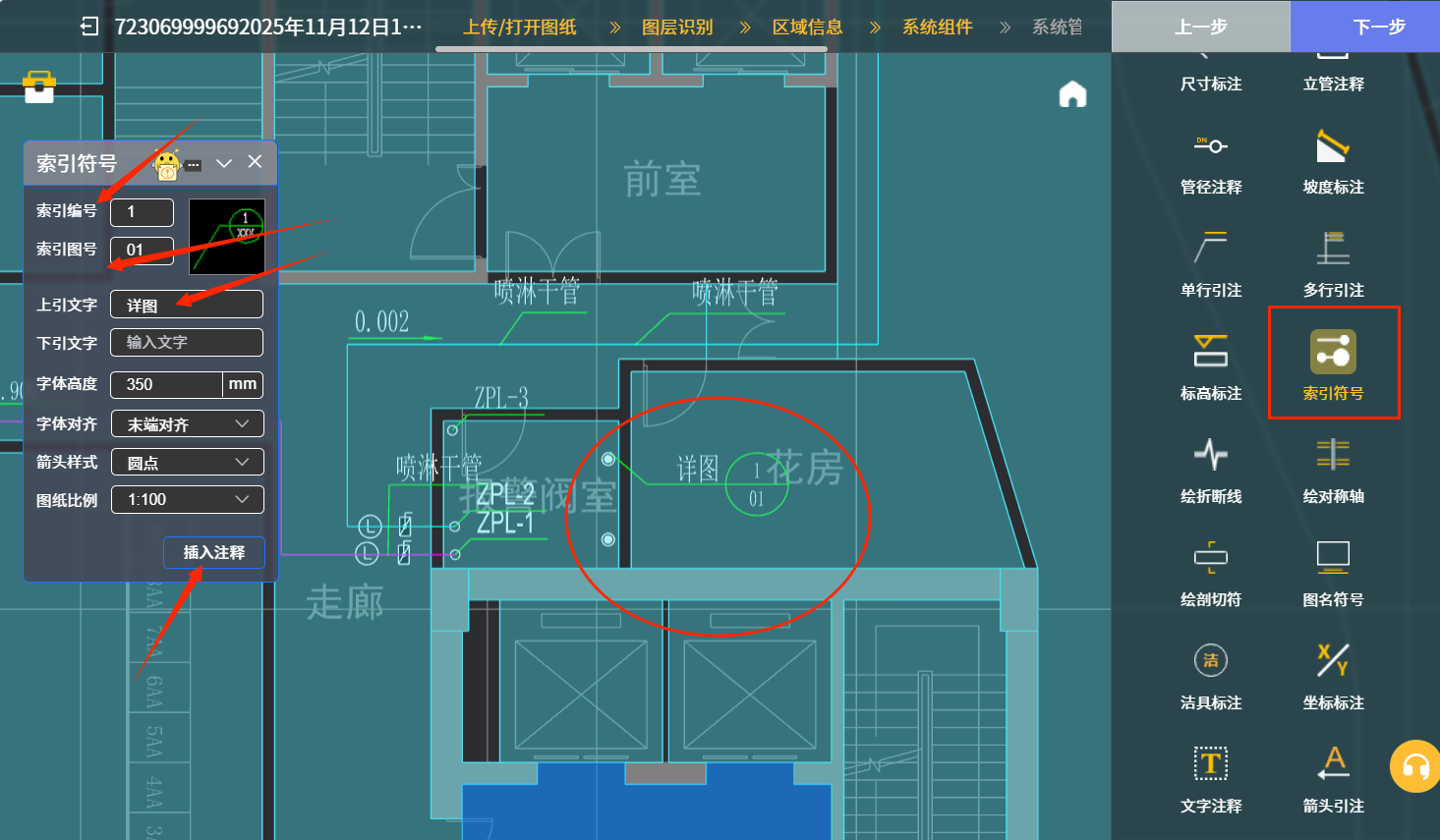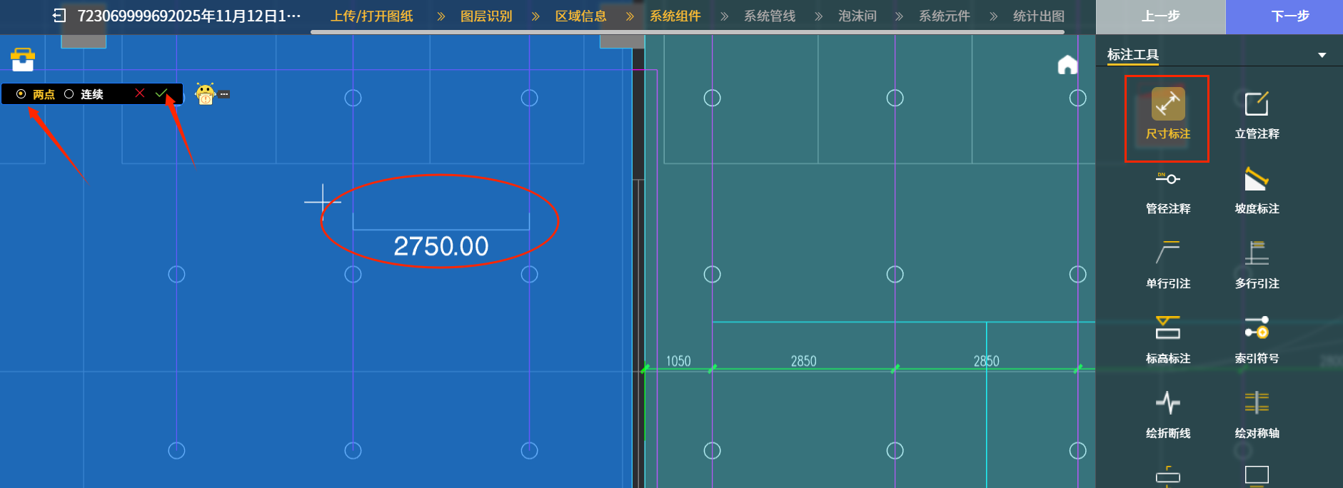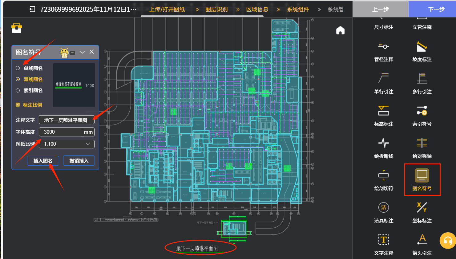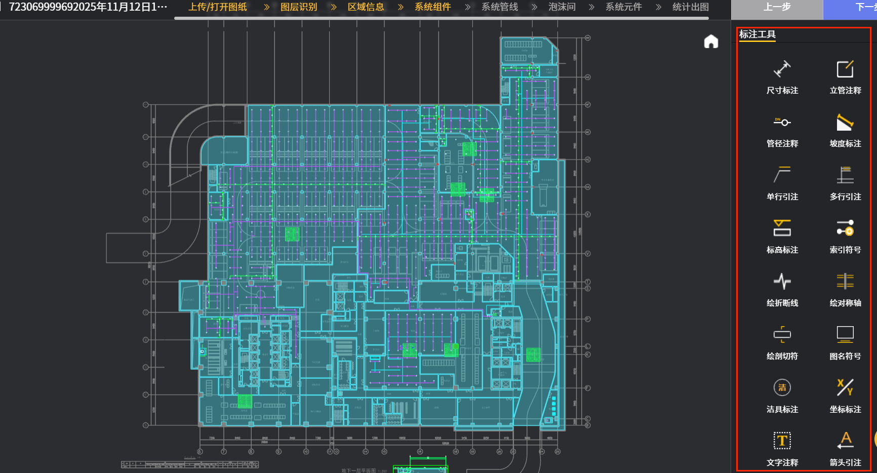 进入“系统组件”页面后,经过图层识别和区域识别后的图纸可以进行组件的自主生成。框选范围自动生成消防设施和管道后会呈现下图一的结果。下图一右侧“标注工具”栏包含红框内的16个图标,主要是对图中的内容进行尺寸标注,管径注释,标高标注,索引,引注,插入图名,文字注释等编辑工作。