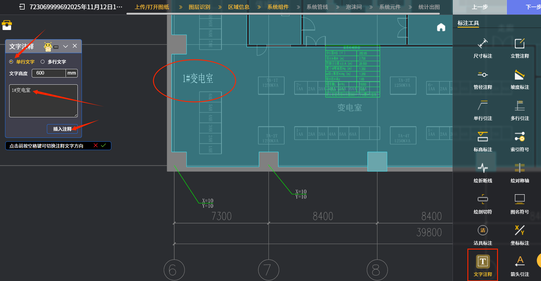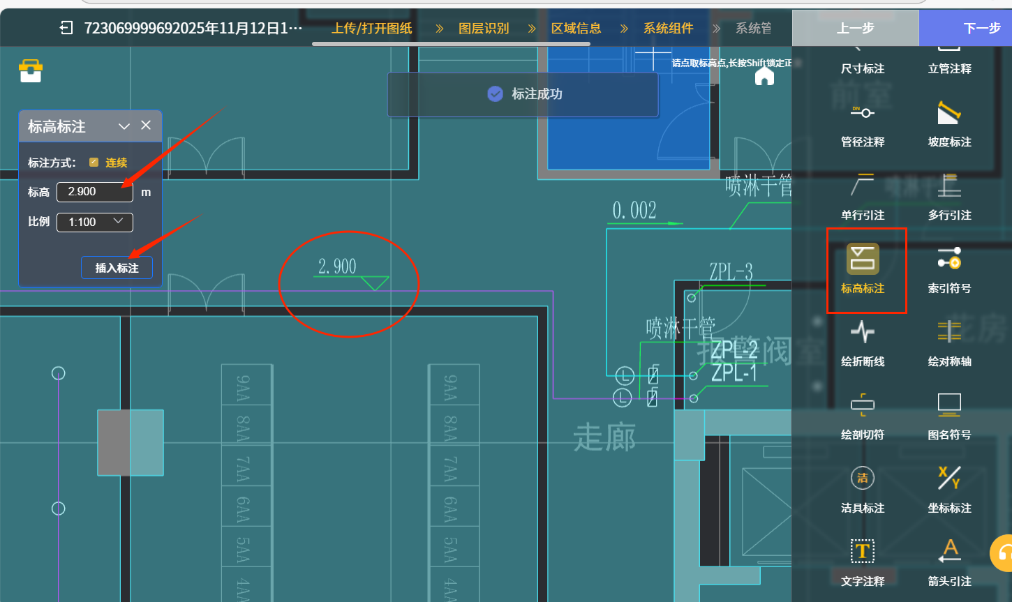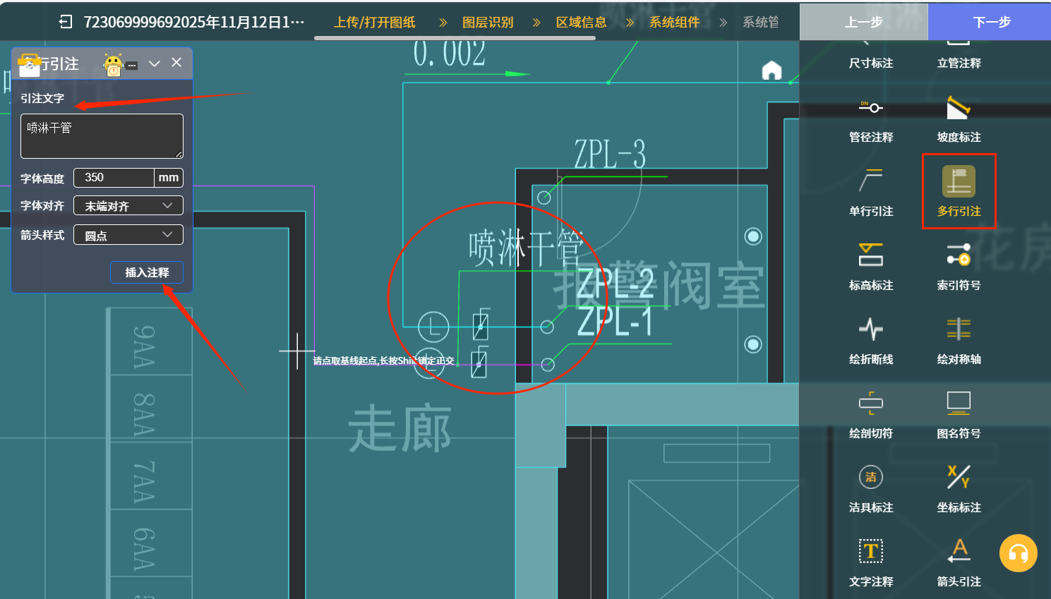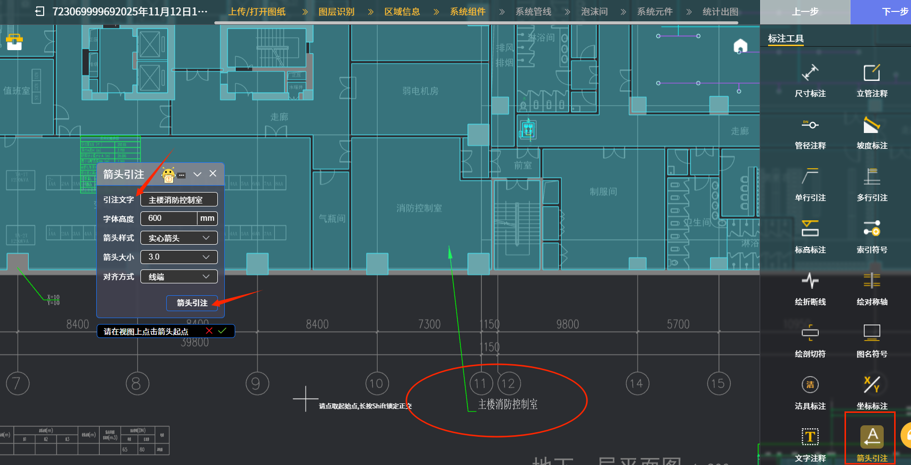 进入“系统组件”页面后,经过图层识别和区域识别后的图纸可以进行组件的自主生成。框选范围自动生成消防设施和管道后会呈现下图一的结果。下图一右侧“标注工具”栏包含红框内的16个图标,主要是对图中的内容进行尺寸标注,管径注释,标高标注,索引,引注,插入图名,文字注释等编辑工作。