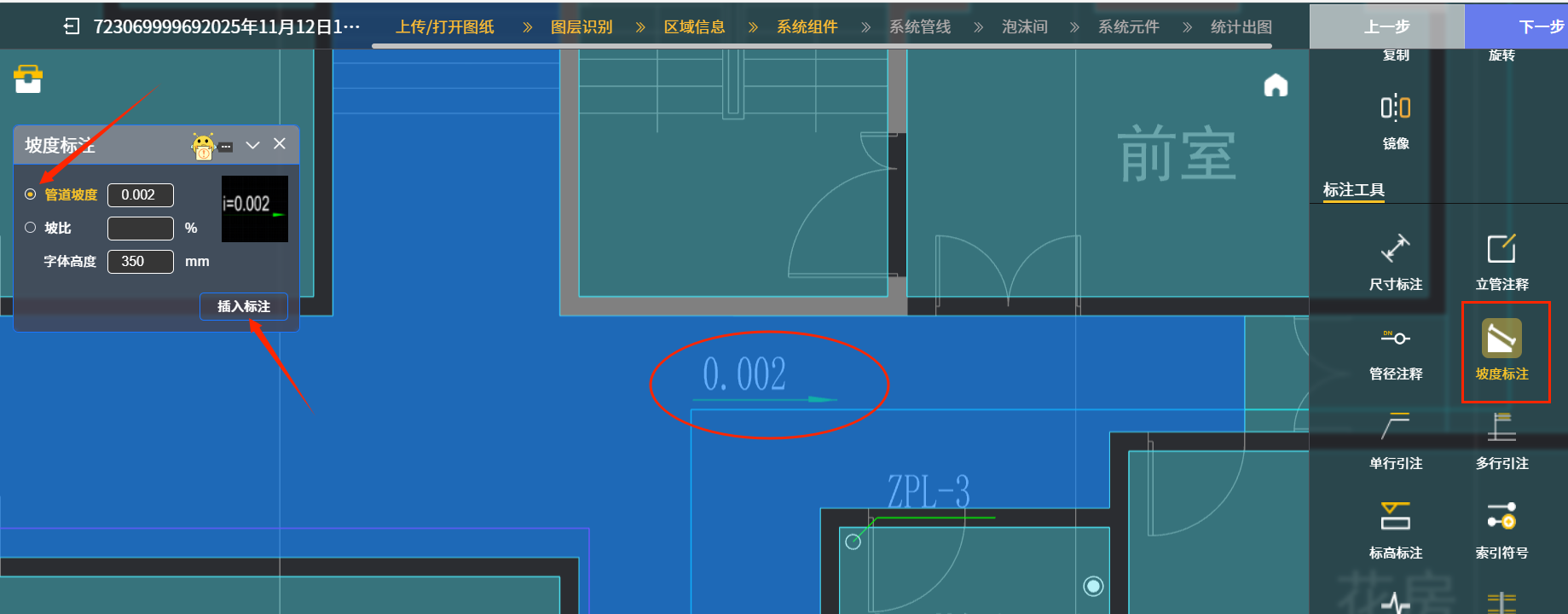 举例四:点“坡度标注”图标后,下图五中箭头处可选择“管径坡度”或“坡比”2种选项(二种都可以输入坡度),随后点击“插入标注”图标,同时选中要标注坡道的管线,就可以进行坡度标注了,椭圆红框内即为插入标注的操作结果。