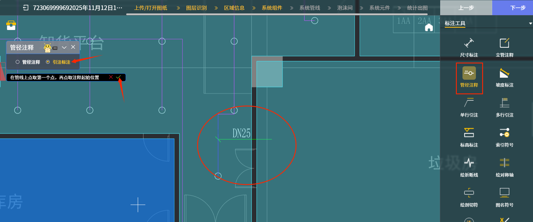 举例三:点“管径注释”图标后,下图四中箭头处可选择“管径注释”或“引注标注”选项,随后选择需要注释的管线,选好后点击“√”予以确认;此时椭圆红框处生成管径注释的结果。这个图标主要是对已有管线进行管径注释用的,方便使用者对某些未标注管径的管线进行注释。